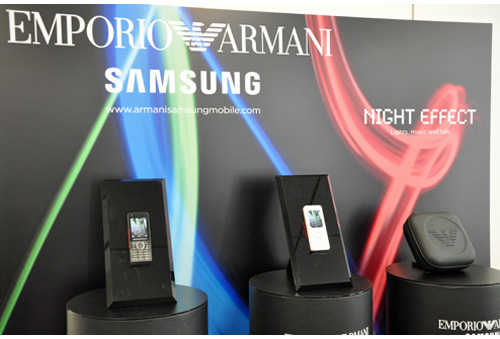 ファッションブランド「EMPORIO ARMANI」とコラボレーションした「NIGHT EFFECT(ナイト エフェクト)」は、GIORGIO ARMANI氏自らが東京のイルミネーションをイメージしてデザインしたストレート型端末。側面にはレッド、グリーン、ブルー3色のLEDを搭載し、起動や発着信の際にはライン状に光る。インターフェイスのデザインもARMANI氏が手がけた。サムスン電子によると、「18-35歳のファッションに敏感な男女」がターゲットだそうだ。