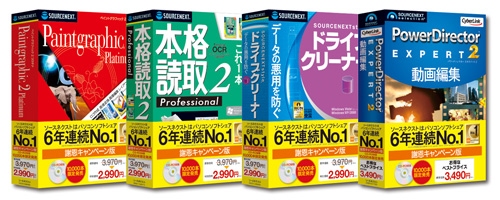 新たに追加するタイトルは、動画編集ソフト「PowerDirector EXPERT 2」、データ消去ソフト「SOURCENEXTstyle ドライブクリーナー」、OCRソフトと名刺管理ソフトのパッケージ「本格読取 2 Professional」、グラフィックソフト「Paintgraphic 2 Platinum」の4つ。