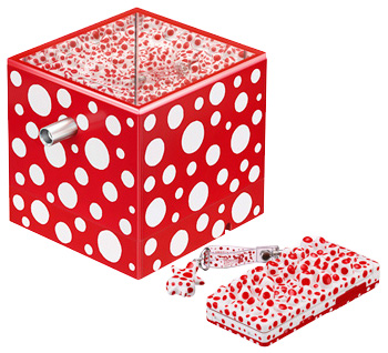 「ドッツ・オブセッション、水玉で幸福いっぱい」は、赤と白のビビッドな水玉模様をモチーフにした作品。携帯電話のほか、オブジェとしての箱とストラップを付属する。箱の側面に備えるスコープをのぞき込めば、中に貼られた鏡によって水玉模様の世界が広がる。草間氏の直筆サイン入り。100台の限定販売で、価格は100万円。