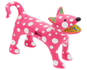 「私の犬のリンリン」は、ピンクの地に白の水玉模様をあしらった犬型のオブジェ。背中のふたを開けると、「リンリン」と同じ柄の携帯電話が収まっている。耳と口の中はオレンジの地に水色の水玉模様を描いた。このほか、ストラップも付属する。「ドッツ・オブセッション、水玉で幸福いっぱい」と同様、オブジェには草間氏の直筆サイン入り。100台の限定販売で、価格は100万円。
