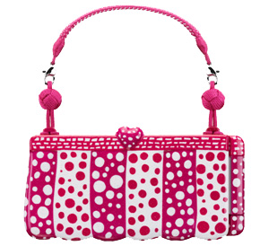 「宇宙へ行くときのハンドバッグ」は、横長のハンドバッグの形をした携帯電話。表面にはピンクと白の水玉模様が描かれている。本体を縦に開けば10キーや液晶画面が現れるほか、側面には手提げ用の紐を備える。紐はフック付きで、取り外すことも可能。1000台の限定販売で、価格は10万円。