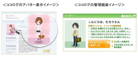 ニフティ(今村隆社長)とスマイルラボ(伊藤隆博社長)は、コミュニティサービス「ニコッとタウン」で提供するアバターを、ブログサービス「ココログ」のプロフィールで表示し、「ココログ」から「ニコッとタウン」を利用できるサービスを7月29日から開始した。