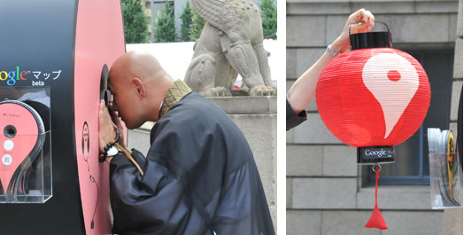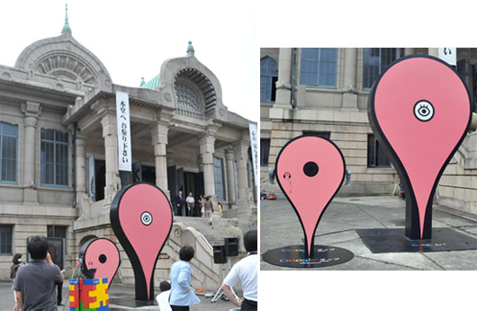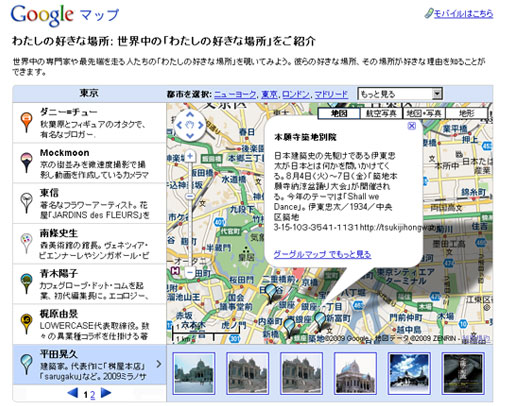 Googleは8月3日、建築家やカメラマン、ミュージシャンなど、専門家や著名人が各自のお気に入りの場所を「Googleマップ」上で公開する取り組み「わたしの好きな場所」と連動し、著名人が選んだお気に入りの場所に「Googleマップ」のピン型のオブジェを設置してインターネットと現実を繋ぐプロモーションを開始。初日の8月3日には、築地本願寺の前に高さ4mのピン型オブジェが現れた。