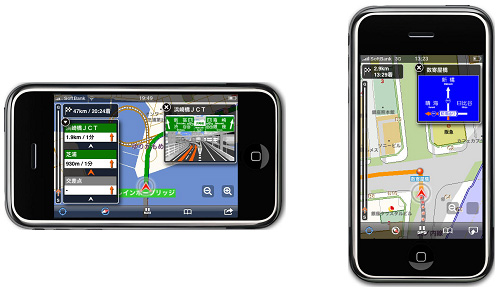 iPhoneのGPS機能を利用し、音声によるルート案内や交差点付近での誘導画像の表示、オートリルートなど、カーナビのような機能を備えるアプリケーション。ルート検索の際に必要な項目として「経由地」のほか、「有料道を利用する」「時間を優先する」「距離を優先する」といった条件を設定することが可能。