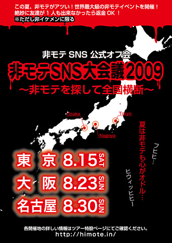 公式オフ会のツアータイトルは「非モテSNS大会議2009~非モテを探して全国横断~」。当日は参加者同士が仲良くなれるグループでのクイズ大会やイベントを行う。友達が1人もできなかった場合は「返金OK(※ただし非イケメンに限る)」。