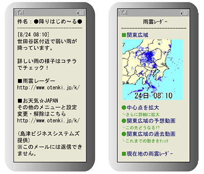 あらかじめGPSなどを利用して位置設定しておくと、その位置を中心にして半径10kmの空を毎時6回監視。降水を発見すると随時メールで通知するサービス。