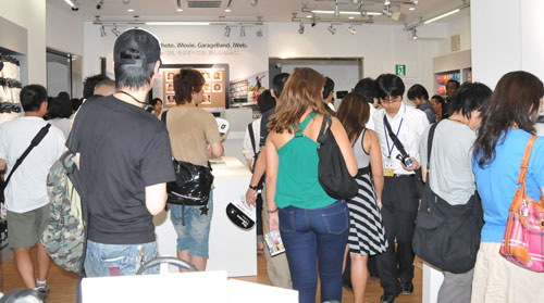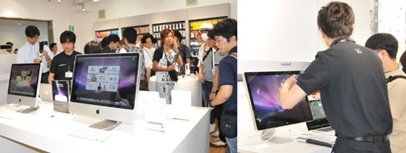 店内は白を基調としたデザインで、入り口付近の両サイドにはMac製品が並ぶ。iPodコーナーは右奥に配置されており、周辺機器も充実している。オープンと同時に店内はたくさんの人で溢れ、Macに興味を持ったお客さんに、店員さんが熱心に説明している姿が見られた。