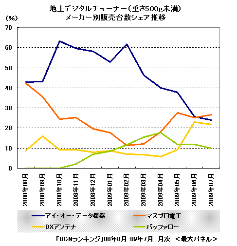 重さ500g未満のモデルに限ったメーカー別の販売台数シェアを見てみよう。この1年で首位をキープしていたのはアイ・オー・データ機器。しかし、08年秋以降シェアを徐々に下げ、09年7月には2位のマスプロ電工が1位の座を奪った。しかし、1位のマスプロ電工のシェアは26.7%、2位のアイ・オー・データ機器は23.9%と僅差だ。このほか、DXアンテナがシェア21.8%で3位、バッファローが9.9%で4位と続いている。