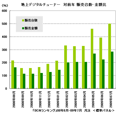 最後に、地デジチューナー全体の市場規模を見ると、販売台数・金額ともに右肩上がりで好調。08年7月に比べて販売台数はほぼ5倍、販売金額では2.8倍とこの1年の成長は著しい。価格も安くなり、ユーザーとしてうれしいのは確か。できるだけ安くテレビをデジタル化したいと考える人や、とりあえず地デジを体験してみたいと思っている人にとっては、手頃な価格でコンパクトになった地デジチューナーは、魅力的な製品といえそうだ。(BCN・井上真希子)