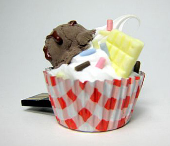 一つひとつ手作りの「スイーツデコ」を施し、思わず食べたくなるようなデザインに仕上げた。パフェはカップ型で、カップは白と赤のキュートなチェック柄。クリームの上にはチョコレートアイスや板チョコをトッピングした。材質はシリコンと粘土。サイズは幅32×奥行き45×高さ35mm、重さは約15g。対応OSは、Windows Vista/XP/2000/Me、Mac OS 9.0以降、Linux Kernel2.4.2以降。