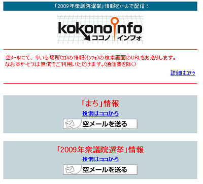 「ココノインフォ」公式サイト上の検索ページからGPS搭載の携帯電話で位置情報を送信することで、今いる場所がどの選挙区に該当するかを知らなくても、小選挙区名、立候補者の名前、党派などの候補者情報を、その場で携帯電話のメールで受け取ることができるのが特徴。