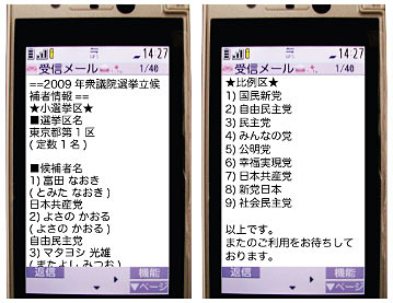 例えば、「東京都港区元赤坂一丁目」で位置情報を送信した場合は、東京都第1区の全候補者名と党派、比例区がメールで送信される。全国300小選挙区の1139人すべての候補者情報を格納しており、日本全国からの利用が可能。サービス提供期間は09年8月20日-31日まで。