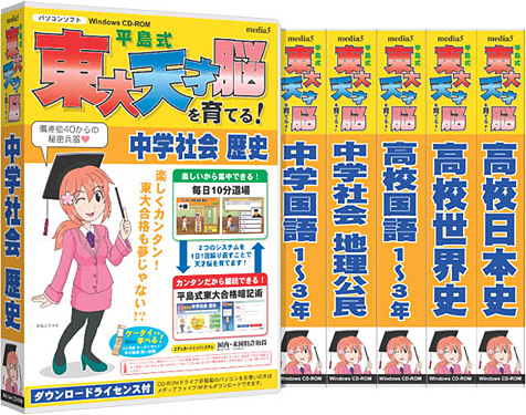 メディアファイブは8月20日、楽しみながら短時間で集中して学習できる中高生向けパソコンソフト「平島式東大天才脳を育てる!」シリーズ6製品を9月4日に発売すると発表した。価格はすべて6090円。対応OSはWindows 7/Vista/XP/2000。