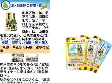 菊正宗酒造記念館には、ゲーム内のアイテムの一つ「お土産」にあたる「灘・菊正宗の特醸・雅(みやび)」をデザインしたプラスチック製カード「コロカ」を用意。ユーザーは記念館を訪れて売店で買い物をすれば、「コロカ」を入手できる。「コロカ」にはシリアルナンバーが印字され、ユーザーはゲーム内で番号を入力することで、ゲーム内通貨「プラ」で「雅」を購入する権利が得られる仕組み。売店で商品を購入した金額に応じて、「雅」が買える数も決まる。