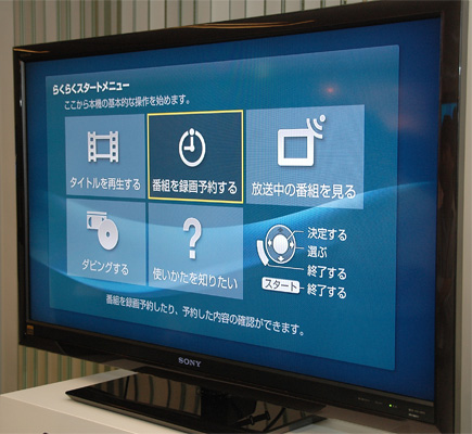 いずれの製品も、基本操作となる録画・再生・ダビングを、初めて使うユーザーにわかりやすくガイドするメニュー画面「らくらくスタートメニュー」を搭載したのが特徴。画面の案内に従っていくことで、「タイトルを再生する」「番組を録画予約する」「放送中の番組を見る」「ダビングする」「使いかたを知りたい」の操作ができる。また、VHSビデオや8ミリビデオからHDDへのダビングに必要なケーブル接続操作も画面上でガイドする。