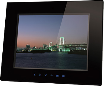 解像度800×600ピクセルの8型液晶を搭載したフォトフレーム。本体の操作はパネルに搭載した光るタッチセンサーボタンを使用する。操作しない時はボタンの光が消えるため、写真鑑賞の邪魔にならない。