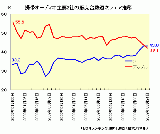 携帯オーディオ市場全体は09年3月以降、販売台数・金額とも前年割れが続いており、あまり元気がない。しかし、アップルとソニーの2強が僅差で争う中、新たに意欲的な製品が両社から発売されれば、再び市場が盛り上がることも期待できそうだ。(BCN・道越一郎)