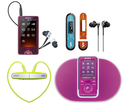 ハイエンドモデルのXシリーズ(左上:NW-X1060)、低価格モデルの着せ替えができるEシリーズ(右上:NW-E042)、ヘッドホン一体型のWシリーズ(左下:NWD-W202)、スピーカー付属タイプのSシリーズ(右下:NW-S636FK)