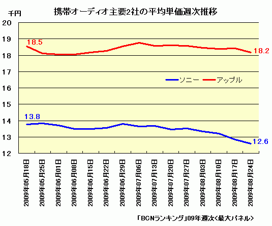 平均単価の下落もソニー製品の販売台数を押し上げた。09年5月第3週(5月18日-24日)の時点では、同社の携帯オーディオの税抜き平均単価(以下同)は1万3800円で、販売台数シェアは36.1%だったが、8月以降平均単価が下がるにつれて、シェアが拡大。8月第2週(8月10日-16日)以降、平均単価が1万3000円を下回ったあたりから4割を突破した。平均単価はアップルより2割から3割安い水準だ。