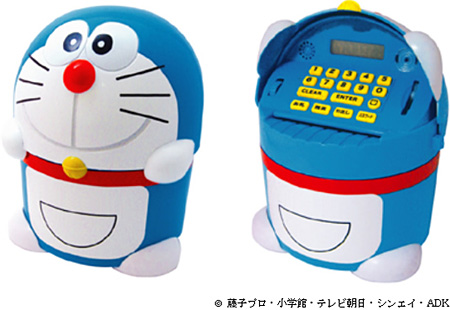 外観がドラえもんそっくりの貯金箱。首の部分を開けると液晶画面や数字ボタン、硬貨・紙幣の投入口が現れる。お金を入れると金額を自動的に判別し、合計金額を画面に表示する。硬貨は1円から500円まで認識する。お金を取り出す際は、あらかじめ設定した暗証番号を入力する。時計機能付き。サイズは約165×130mm。なお、同製品は小学館プロダクションとのライセンス契約によるもの。