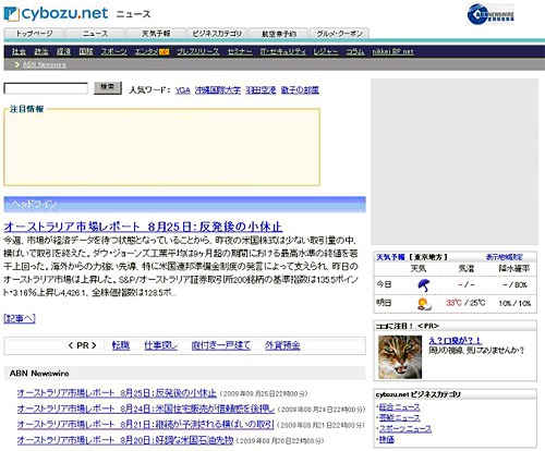 cybozu.netは9月8日、豪ABN Newswireと連携し、ビジネスポータルサイト「cybozu.netニュース」の「プレスリリース」において、「ABN Newswire」が配信する海外の企業ニュース及び金融・株式市場ニュースの提供を開始したと発表した。