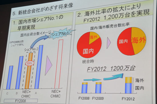 大武氏は「(3社の事業統合により)まず国内のリーディングポジションを確保する。08年の業績では、NECとCHMC両社のシェアを合わせて19%。これを数年でなんとかNo.1の地位にまで持っていく。また、2012年までに海外比率を拡大し、内訳で700万台を国内、500万台を海外として1200万台を目指したい。3社は、補完関係を築けるベストパートナーだと思っている」とコメント。また「新会社の製品はそれぞれのブランドを活用することが重要だ」との考えを示した。