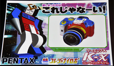 また、そのほかにも、脱力系ロボット玩具「コレジャナイロボ」を販売しているザリガニワークスとペンタックスのコラボモデルとして、「K-x コレジャナイロボモデル」も紹介された。「コレジャナイロボ」のトリコロールカラーを再現したボディ塗装に、油性マジックによる手書きで顔(ストロボ)部分を書き込んで仕上げられるという1台。