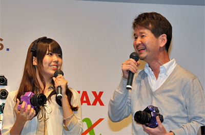 一方、ライトブルーのボディと黒のグリップを選択した泉さんは「普段は古い町並みなんかを撮ります。いつもの取材では手軽なコンパクトデジカメを持ち歩いているんですが、(「K-x」も)こういう本格的なカメラとしては軽くて持ちやすいですね」と感想を語った。