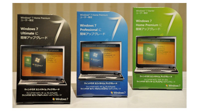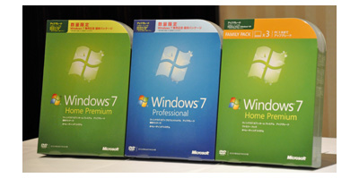 (左と中央)Windows 7発売記念優待パッケージ、(右)Windows 7 Home Premium アップグレード版ファミリー パック