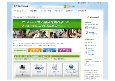 また同社は、PCや周辺機器、PCソフトなどのWindows 7対応製品を確認できる「Windows 7 互換性情報サイト」を9月24日に開設した。Windowsロゴ取得の有無や製品ジャンル、メーカー名など条件を絞り込んで検索することができる。