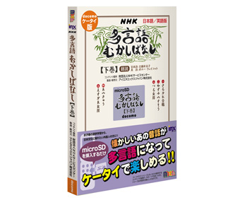 microSDカードに、4か国語で放送中のNHKデジタルラジオ「多言語むかしばなし」のうち日本語と英語を収録。携帯の画面で動画と音声・字幕の言語を自由に組み合わせて表示でき、語学学習コンテンツとして利用できる。動画の早送り/巻き戻し機能や、前回見たところから続きを再生できるレジューム再生などの機能も備える。