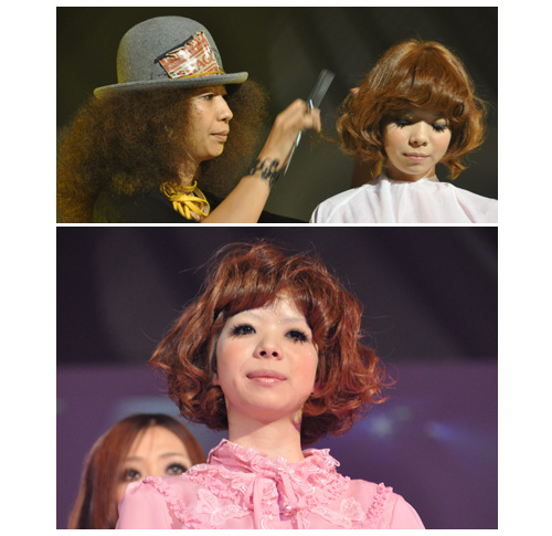 ヘアサロンのイベントといえばやはり、美容師による実演が魅力の一つ。「TAYA」のステージでは、サロンでのカットの際に使うポンチョを身にまとった7人のモデルが登場。モデルそれぞれに美容師が付き、軽快な手さばきでハサミを操り、髪をカットしていく。スタイリング後、ポンチョを取り払うと、ショートパンツとピンクのトップスを組み合わせたカジュアルな服装が現れた。ヘアはゆるやかなカールのかかった柔らかさのあるボブに仕上がり、リボンやレースの付いたガーリーなトップスにぴったりだ。