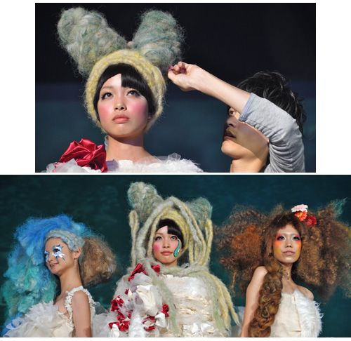 「ACQUA」は、まるで魔法の国で暮らしているキャラクターのような、白を基調とした衣装が印象的だ。衣装は素材に秋冬らしいファーや毛糸を用いたほか、ギャザーを多用したくしゅくしゅっとしたデザイン。ステージ上ではヘアカットに加え、毛糸でできた「おだんご」も頭に盛られていく。更にメイクとして、モデルの目元や頬に白や青、オレンジなどのペインティングを施し、アクセントとした。ヘアとファッション、トータルで秋冬を主張したあたたかみのあるデザインだ。
