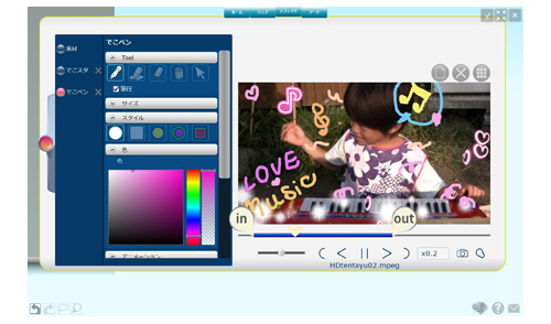 「LoiLoTouch」は、動画ファイルのサムネイルを「触る」「投げる」「くっつける」操作をすれば、手軽にビデオ編集できるのが特徴。「触る」は、ファイルをタッチすると再生が始まるほか、プレビューとタイムラインが表示される編集画面では、さまざまなエフェクトを手書きで追加できる。例えば、タイムライン上に動画ファイルを並べた後、好みのペンとカラーを選択して任意のファイルの上に子どもの名前などの文字を書き込めば、手書きのテロップが挿入できる。