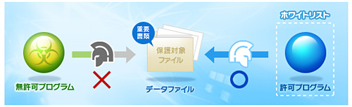 登録されているプログラムだけにファイルへのアクセスを許可する「ホワイトリスト」方式を採用したのが特徴。ウイルス、マルウェアからのファイルアクセスによる情報漏えい被害を未然に防ぐ。