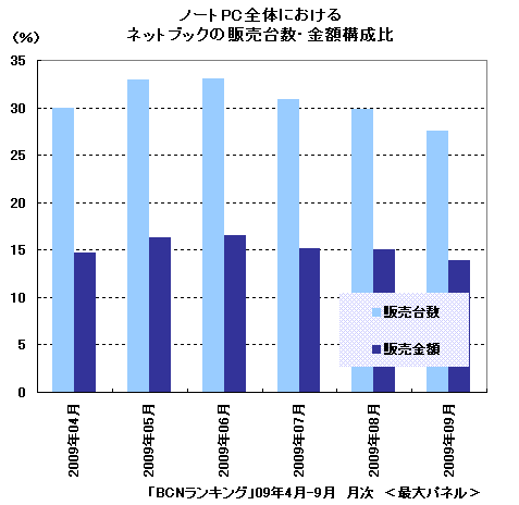 一方、ノートPC全体に占めるネットブックの比率の拡大は、ほぼ止まった状態。もっとも構成比が高かったのは09年6月で、販売台数の33.1%をネットブックが占めていたが、以降やや勢いが弱まり、9月には27.5%と3割を下回っている。(BCN・井上真希子)
