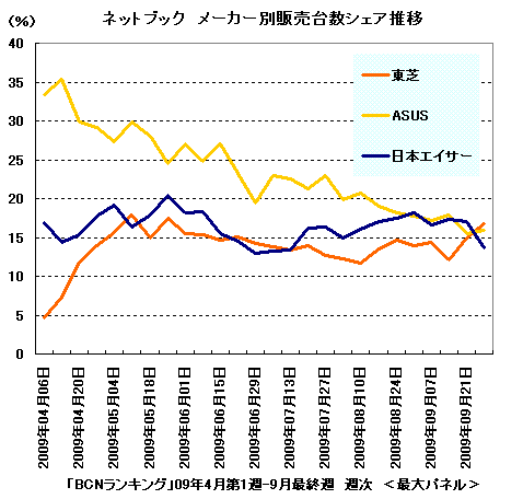 ネットブックの販売台数シェアで東芝が初めて首位を獲得した。これまで台湾勢が優勢だったネットブック市場だが、日本メーカーが初めてトップの座についた。9月最終週(09年9月28日-10月4日)の「BCNランキング」で明らかになったもの。これまでトップを走ってきたASUSTeK Computerの販売台数シェア15.9%に対し、東芝は16.7%と、0.8ポイントの僅差ながら上回った。