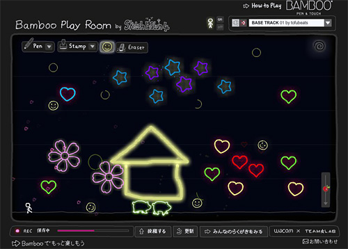 また、ワコムでは10月6日に「Bamboo」シリーズの楽しさを体感できる特設キャンペーンサイト「Bamboo Play Room」を開設。Webページに用意されたペンやスタンプなどを落書き感覚で使い、愉快な絵や音楽を遊びながら作成できる。描いた作品は保存して投稿することができ、他の人の作品を再生して楽しむこともできる。もちろん、ペンタブレットを使って思い通りにペンを走らせることも可能。