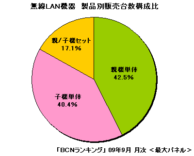 そのほか、製品別の販売台数構成比を見てみると、親機単体もしくは子機単体を購入する人が多いことがわかる。最近のPCは無線LAN機能が内蔵されているモデルが多く、親機を購入するだけで済む場合が多いことに加え、すでに無線LAN環境を構築している人が、新たなPCの接続用に子機を購入しているためと考えられる。また、親機とアダプタのセットがあまり売れていないということは、無線LANを初めて導入するユーザーが少なくなり、多くの家庭で無線LANが一般的になってきていることの現れといえるだろう。