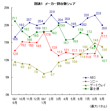 市場が停滞を続けるなか、シェア争いは激しさを増している。昨年10月以降、台数ベースでNECがトップシェアを持続、富士通とゲートウェイ、ソニーの3社が追い上げる展開にあるが、直近の9月ではソニーがトップシェアを射程圏内にとらえる急伸ぶりとなった。ソニーのシェアは8月が11.8%、9月は17.7%で、20.0%とやや伸びを欠いたNECに2.3ポイント差に迫ってきた(図表1)。