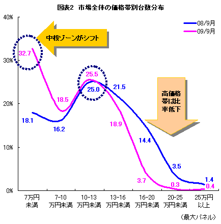 ソニーの躍進要因を探る前に、デスクトップPC全体の価格帯別台数分布(図表2)をみていこう。ここからも分かるように、1年前の08年9月では「10-13万円未満」が25.0%を占めて最大のボリュームゾーンとなっていたが、直近の9月では「7万円未満」の比率が32.7%と上昇、一気に低価格帯へと中軸ゾーンはシフトした。同時に13万円以上の価格帯も軒並み比率を下げており、急速に低価格化がすすんだことを示している。