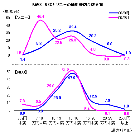 こうした市場動向のなかで、9月にシェア1、2位を占めたNECとソニーの価格帯別台数分布(図表3)をみると、両社は対照的な分布曲線が現れていることが分かる。NEC(図表3下)は、1年前と直近9月の曲線に大きな変化はなく、いずれも「13-16万円未満」が中軸ゾーンを占めてほぼ左右対称の分布。一方、ソニー(図表3上)は、1年前の「13-16万円未満」から「7-10万円未満」へと中軸ゾーンはシフト、左右対称は崩れ低価格帯となる左サイドに重心が偏る動きとなっている。