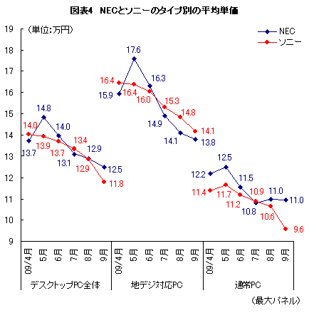 図表4では、NECとソニーの平均単価の推移を「デスクトップPC全体」と地デジチューナーを搭載した「地デジ対応PC」、チューナーを搭載していない「通常PC」に分けて示した。まずデスクトップ全体では、両社とも平均単価を下げる傾向あるが、9月はソニーが一気に11万8000円と8月に比べて1万円以上の大幅下落となった。この単価推移が示すように割安感が消費者の購買意欲を刺激、結果的にシェアを押し上げる要因となったようだ。一方、「地デジ対応PC」と「通常PC」でみると、やや開きがある。9月の「地デジ対応PC」ではソニーはNECに比べて小幅高だが、「通常PC」ではNECが11万円でソニーは9万6000円と価格差は大きい。