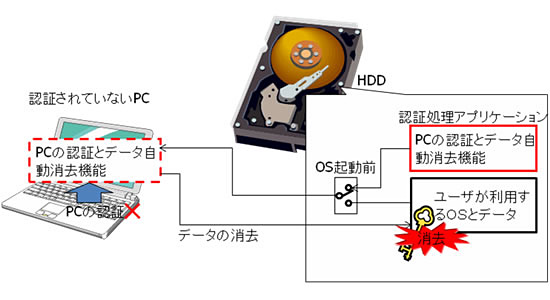 Opal SSC仕様では、OSを起動する前に認証処理を行うアプリケーションを実行することができる。そこで今回、HDDと接続したPCの認証を行うアプリケーションを新たに開発。Opal SSC仕様に基づいて当該アプリケーションを実行することで、あらかじめ認証されたPCではないと判断された場合、データの消去のほか、OSやデータへのアクセスを制限し、PCの起動を中止する。