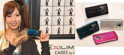 カシオ計算機製の「EXILIMケータイ CA003」は、有効約1217万画素のCMOSセンサーを搭載したカメラ付き端末。28mmの広角レンズや約3倍のデジタルズームを備える。「高速連写」機能を搭載し、毎秒20枚の連写ができる。また、同社のコンパクトデジタルカメラ「EXILIM」と同様に、動く合成写真が作成できる「ダイナミックフォト」機能も備えた。