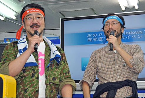 まず、インテルの「神様」こと天野信彦氏と、「改造バカ」ことライターの高橋敏也氏が、それぞれ青と赤のWindows 7ハチマキを巻いて登場。天野氏は「Vistaをすっ飛ばしてXPでずっと頑張っている人にも、Windows 7はオススメ。辛口のわたしが良いと言ってるのだから、信じて欲しい」と語り、会場の期待はいやが上にも高まる。