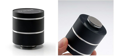 机やガラス、金属、ダンボールなど、本体下部に接触した対象物全体を振動板として利用し、大型の仮想スピーカーとして音を出す仕組み。例えば机に設置した場合、机全体がフラットスピーカーになり、机のどこにいても同じ音量で聞き取ることができるため、ミーティングやプレゼンテーションなどで活用できる。本体下部には設置時に対象をしっかり吸着できるよう、シリコン素材を採用した。