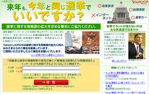 ヤフーは10月28日、選挙期間中のインターネット利用の解禁を求めるため、賛同署名を求めるサイトを開設した。同日から2010年の通常国会開催までに集めた署名を、関連のある省庁や議員に提出する予定。