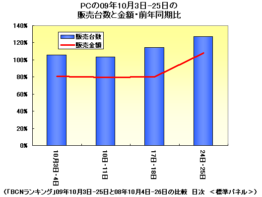 発売直後の勢いを見るため土日のPC販売状況を集計したところ、最初の週末にあたる09年10月24日と25日は、前年と同じ時期(25日と26日の土日)に比べ、台数で27.0%増、金額で8.1%増を記録した。
