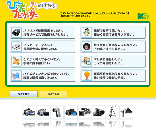 「ぴったんこナビゲーター(ビデオカメラ編)」では、レンタルサービス利用者に随時実施しているアンケート「レンタル商品の利用目的」の中から、「パソコンで映像編集をしたい」「とにかく軽くて小さいモノ」「ブレずに撮影したい」など、ポピュラーな回答を8項目ピックアップ。各項目に「レンタルカメラショップ」の売れ筋アイテムを関連付けることで、目的に合った製品を選ぶことができる。